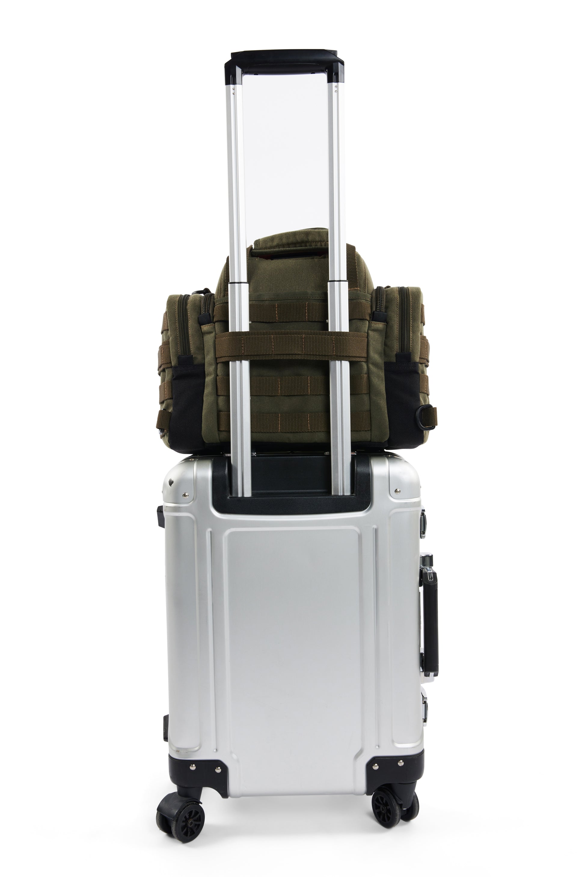Its handles, straps and grab points are multi functional and make for a compact and convertible design. It also has a luggage loop to slide over the handle of your carry on luggage.